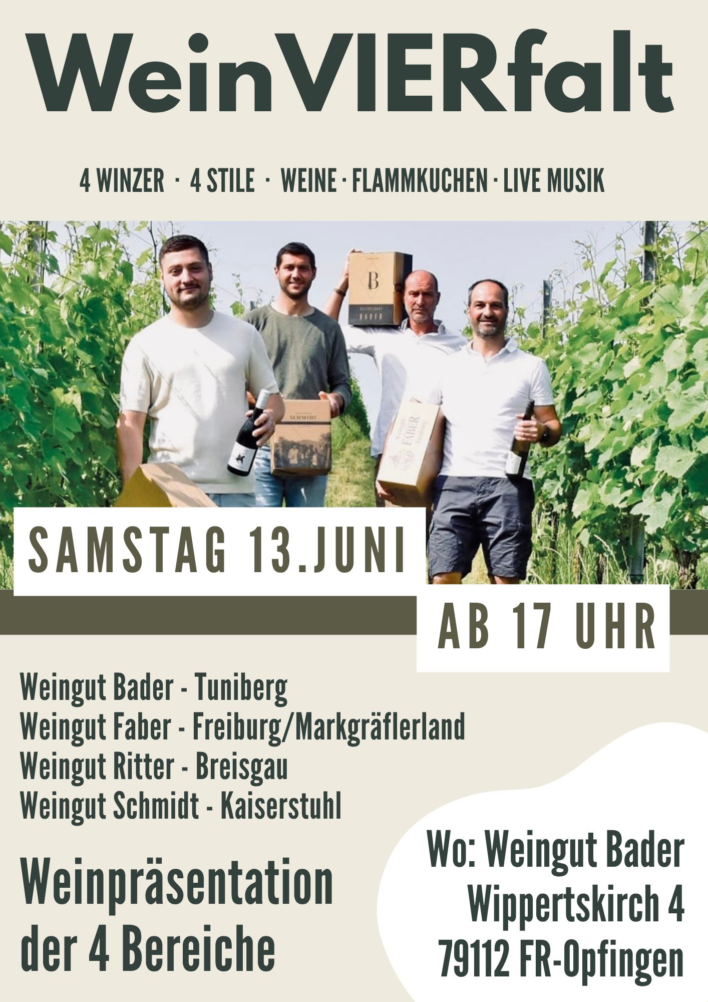 Im Herzen vom Tuniberg, auf der Anhöhe Wippertskirch in Freiburg-Opfingen, betreibe ich, Tobias Bader, unser kleines ausdrucksstarkes Familienweingut mit Event-Scheune. Nach generationsübergreifenden Erfahrungen im Weinbau, entschlossen wir uns im Jahre 2003, unseren Lebenstraum zu verwirklichen und gründeten unser Weingut.